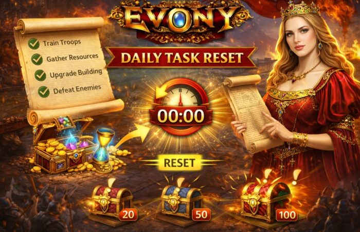 Daily tasks in Evony reset once per day based on the server reset time. After reset, the full list becomes available again regardless of previous progress. Each task contributes points toward daily reward chests, which hold resources, speedups, and other progression items. Missing a reset window means losing one full cycle of value.